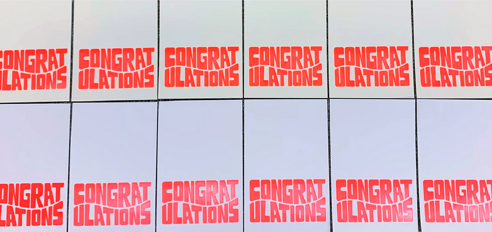 Letterpress Cards: To create the fun and funky lettering for the “Congratulations” on the front of the card, I used Adobe Illustrator. I started sketching the block letters that lined up with the wave shape. I then vectorized my sketch using basic rectanlge shapes that I edited with the pen tool. Each letter started out as a rectangle, and took their form using other shapes and the shape builder tool to subtract the negative (white) space. From this digital design, a photopolymer plate was created to be used on the letterpress with flourescent red-orange ink. The inside of the card reads, “you did that thing!” It was created using traditional letterpress methods—hand-setting lead type pieces in a composing stick which was set in a form with furniture (wood blocks) to be printed on the letterpress. [Spring 2022]